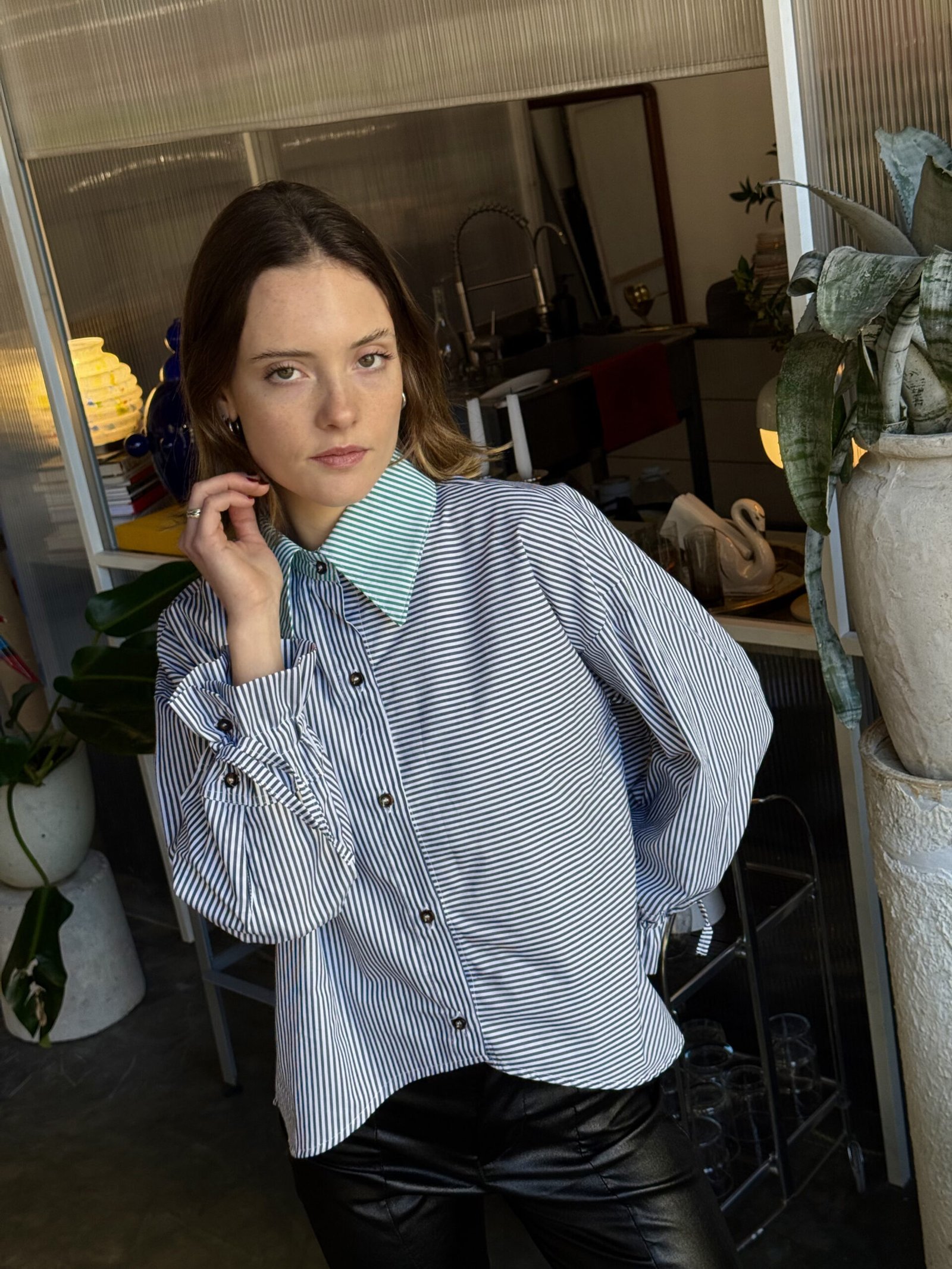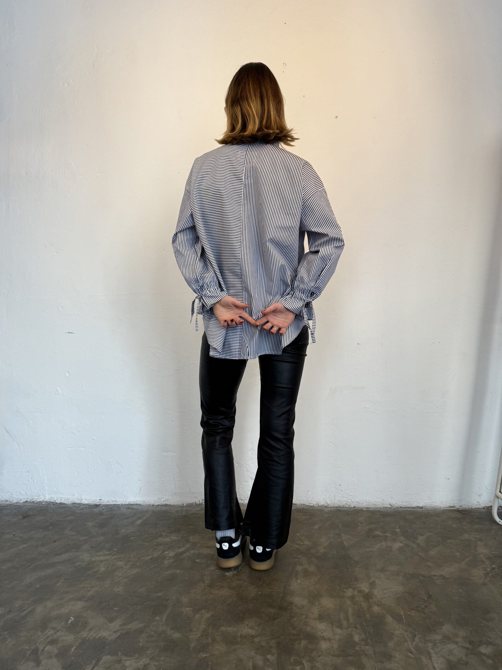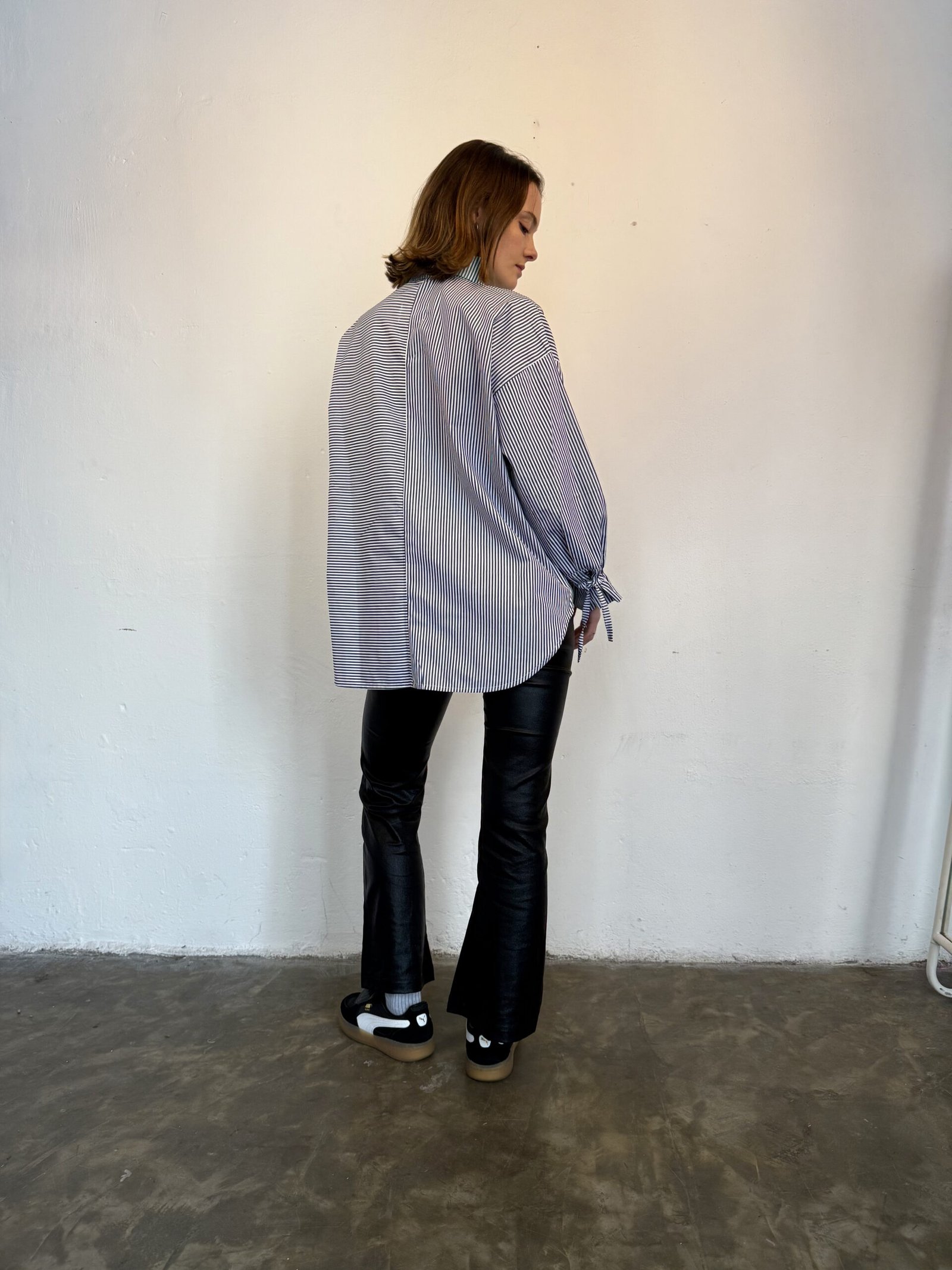 La camisa Bruna esta hecha en popelina de 100% algodon, con rayas combinadas y botones marmolados a tono. Es corta adelante y larga atras. Un corte que queda espectacular.