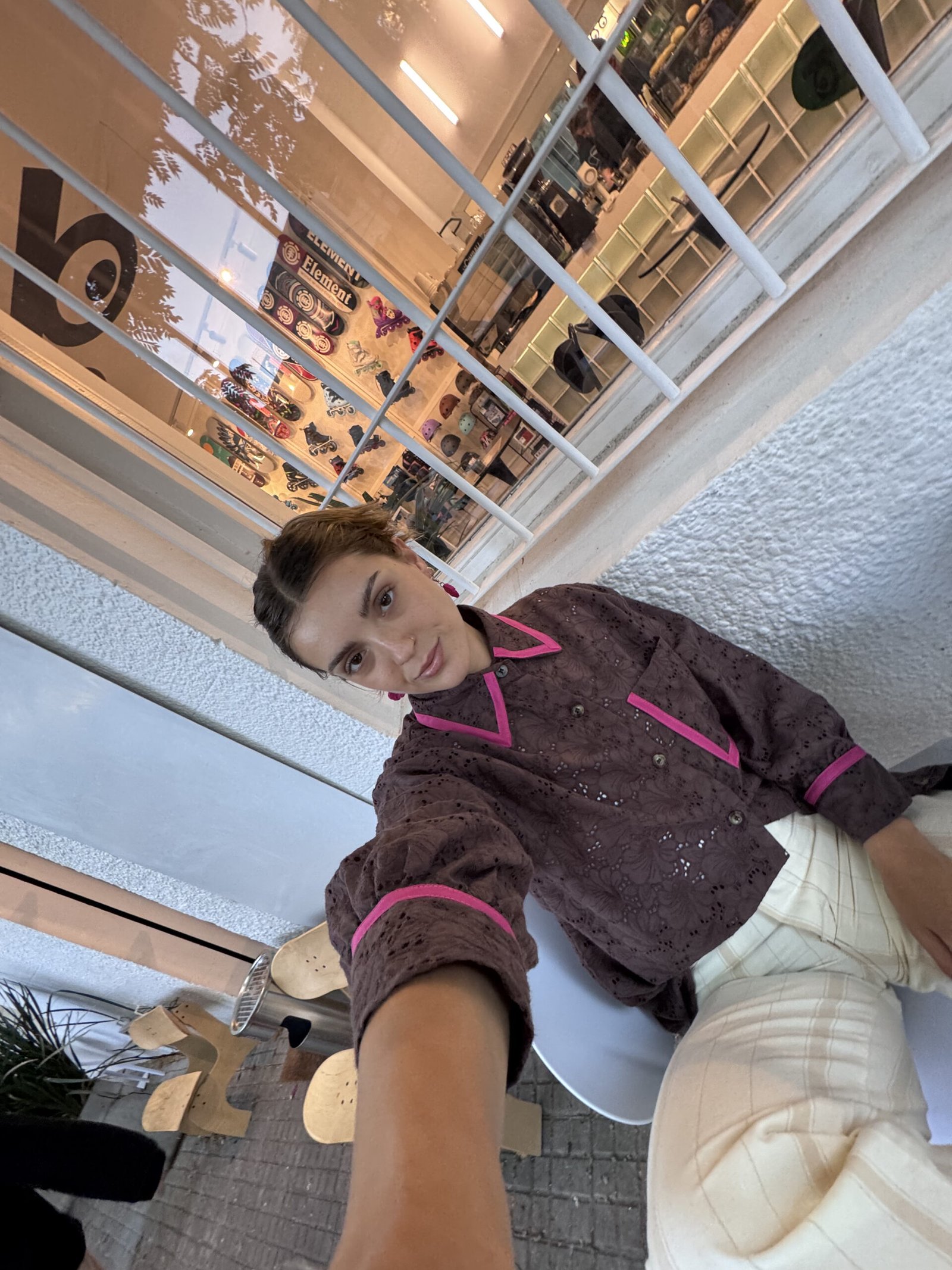 La Camisa Siena es de broderie con detalles en bies fucsia. Es 100% de algodón y tiene un corte amplio y estilo relajado, combina textura y color para un look moderno y canchero.